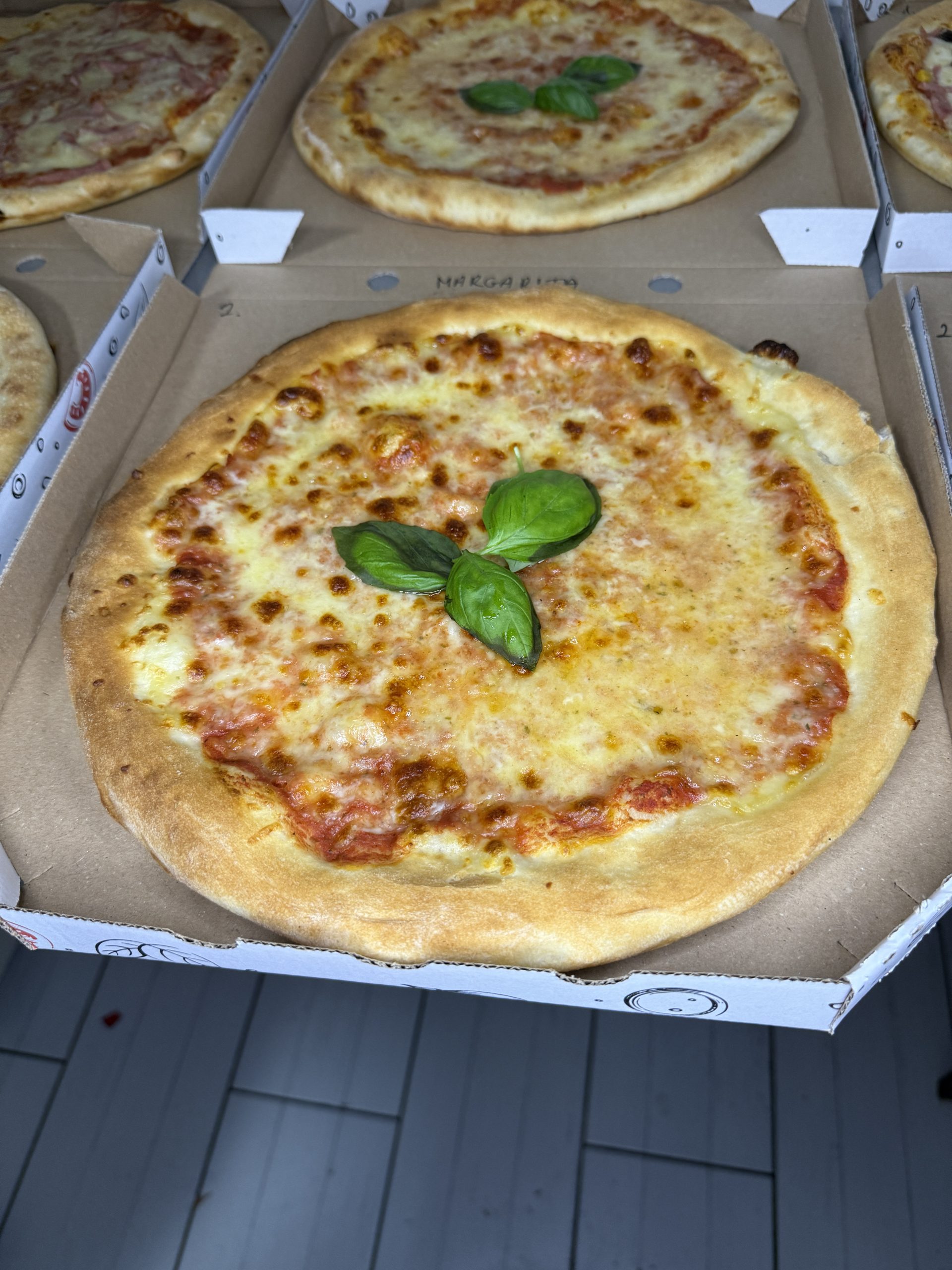 Klasszikus ízek szerelmeseinek! Puha tésztán házi paradicsomszósz, olvadt mozzarella és friss bazsalikom találkozik – egyszerű, mégis ellenállhatatlan.