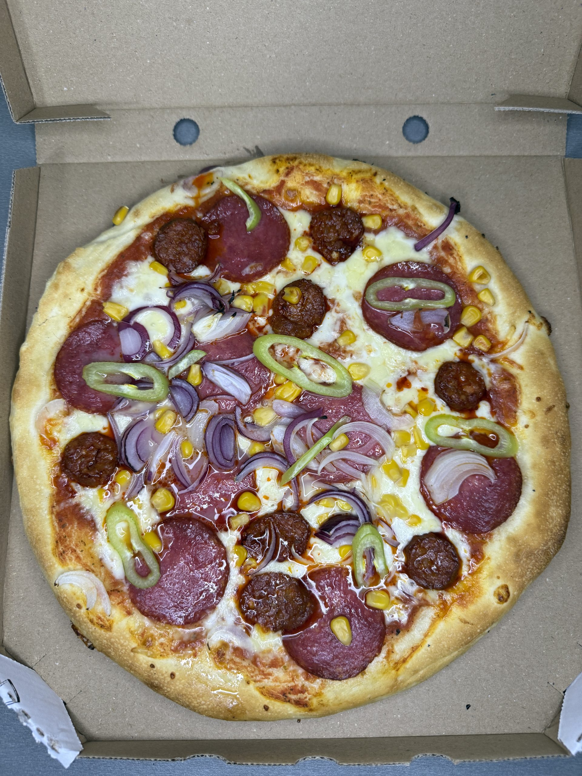 Egy igazi magyaros ízbomba! Vastag tésztán házi paradicsomszósz, olvadt mozzarella, fűszeres szalámi, hegyes erős paprika, hagyma, édes kukorica és zamatos kolbász egyesül egy laktató, pikáns élményben.